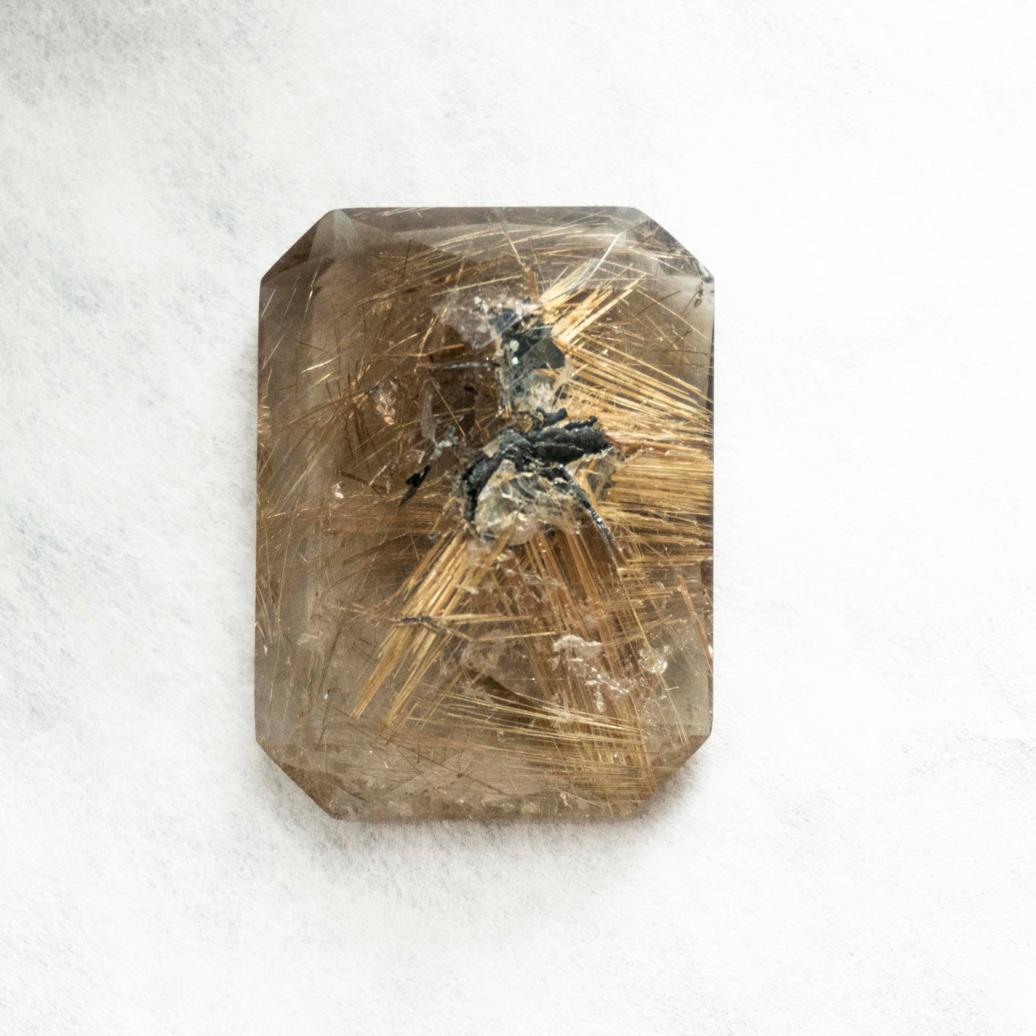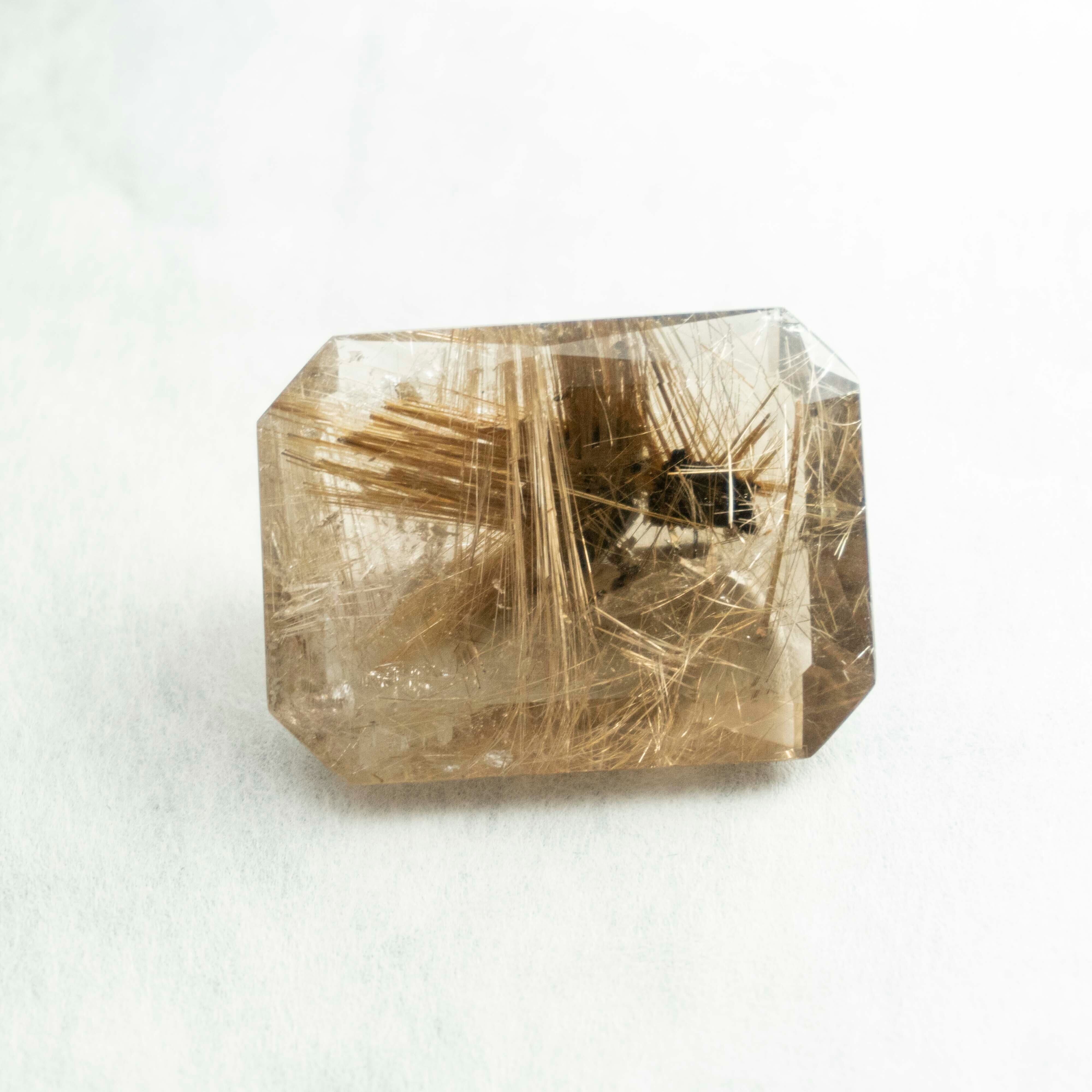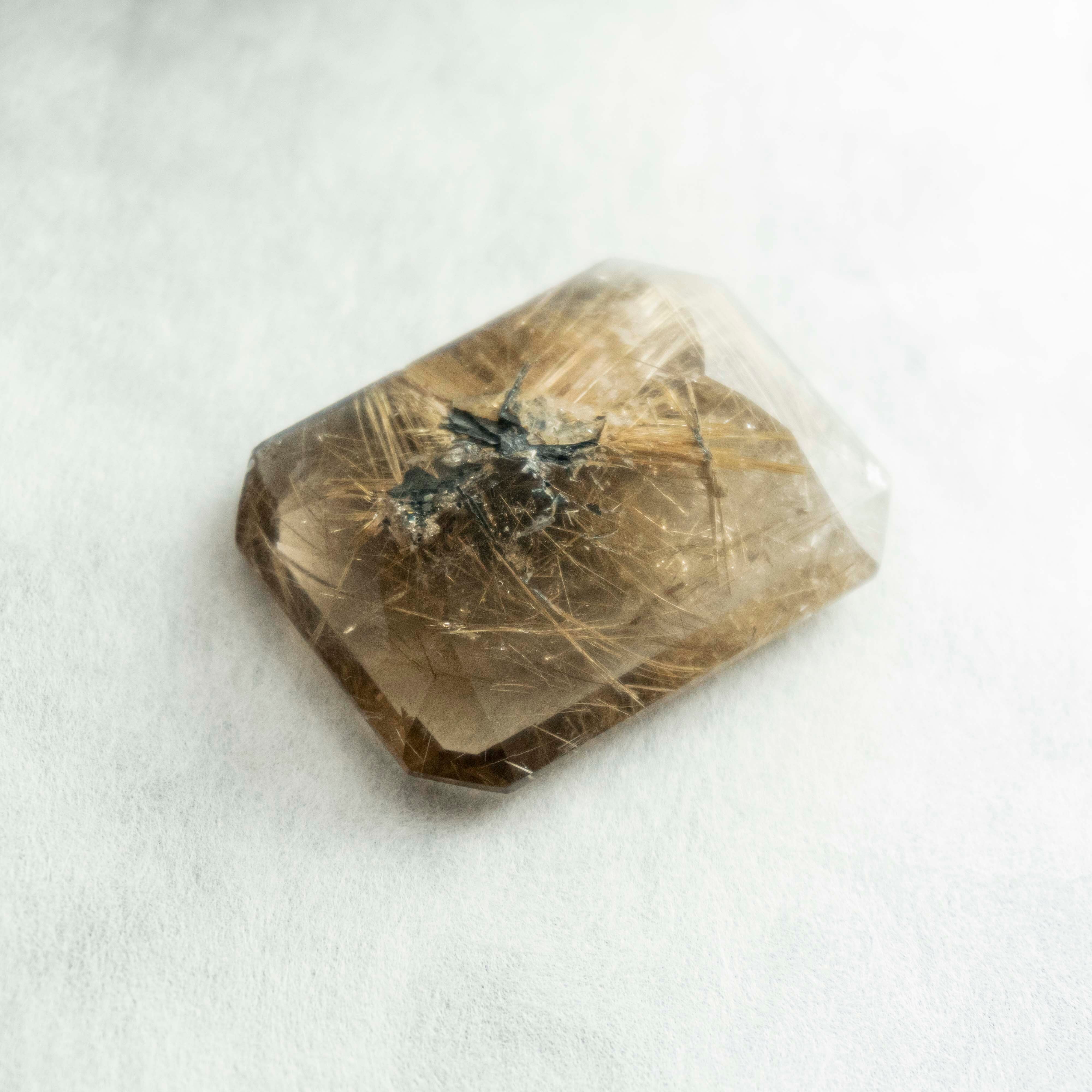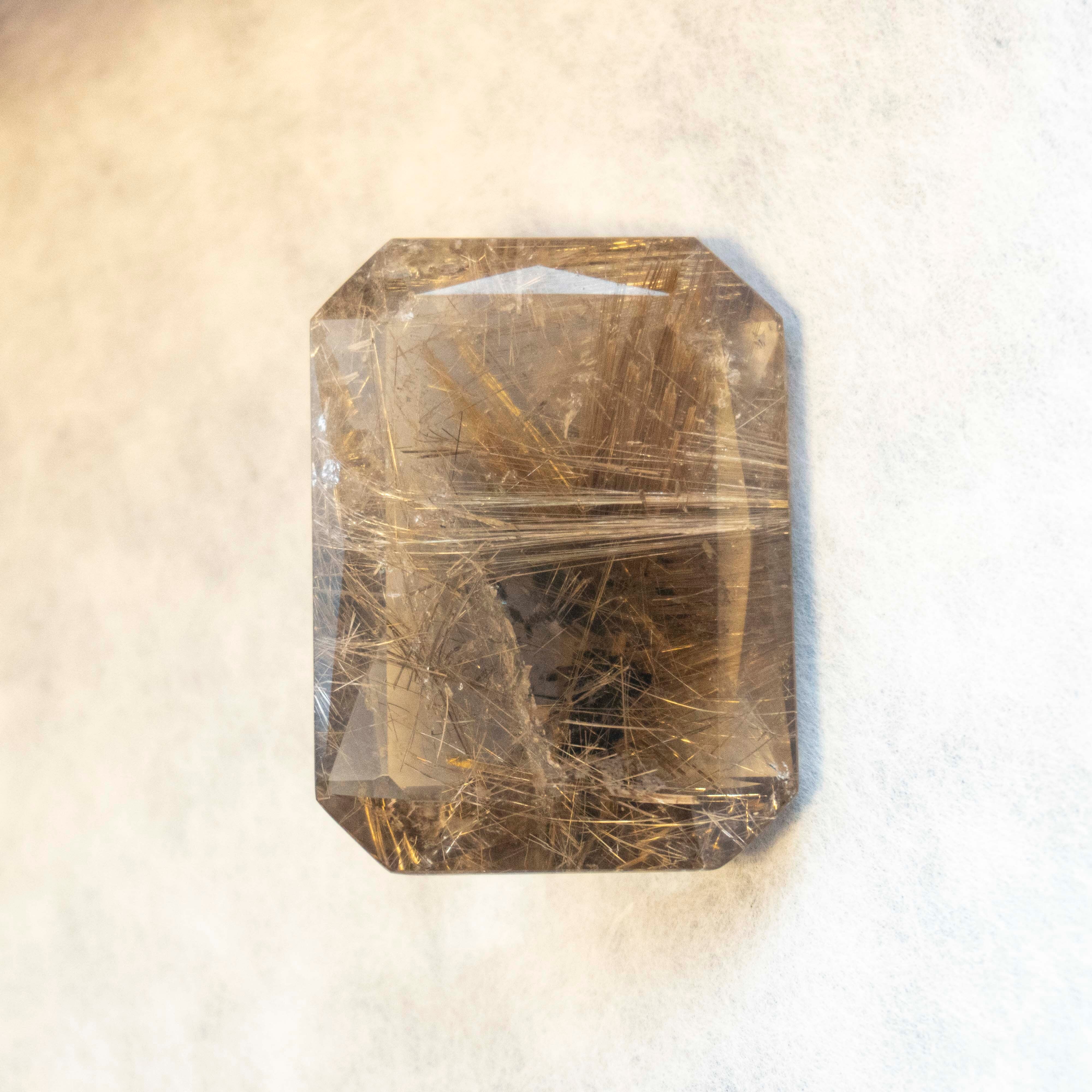 状態: 希少な「太陽放射(サンバースト)」パターンを持つ、スモーキータイチンルチルのファセット・ルースです。