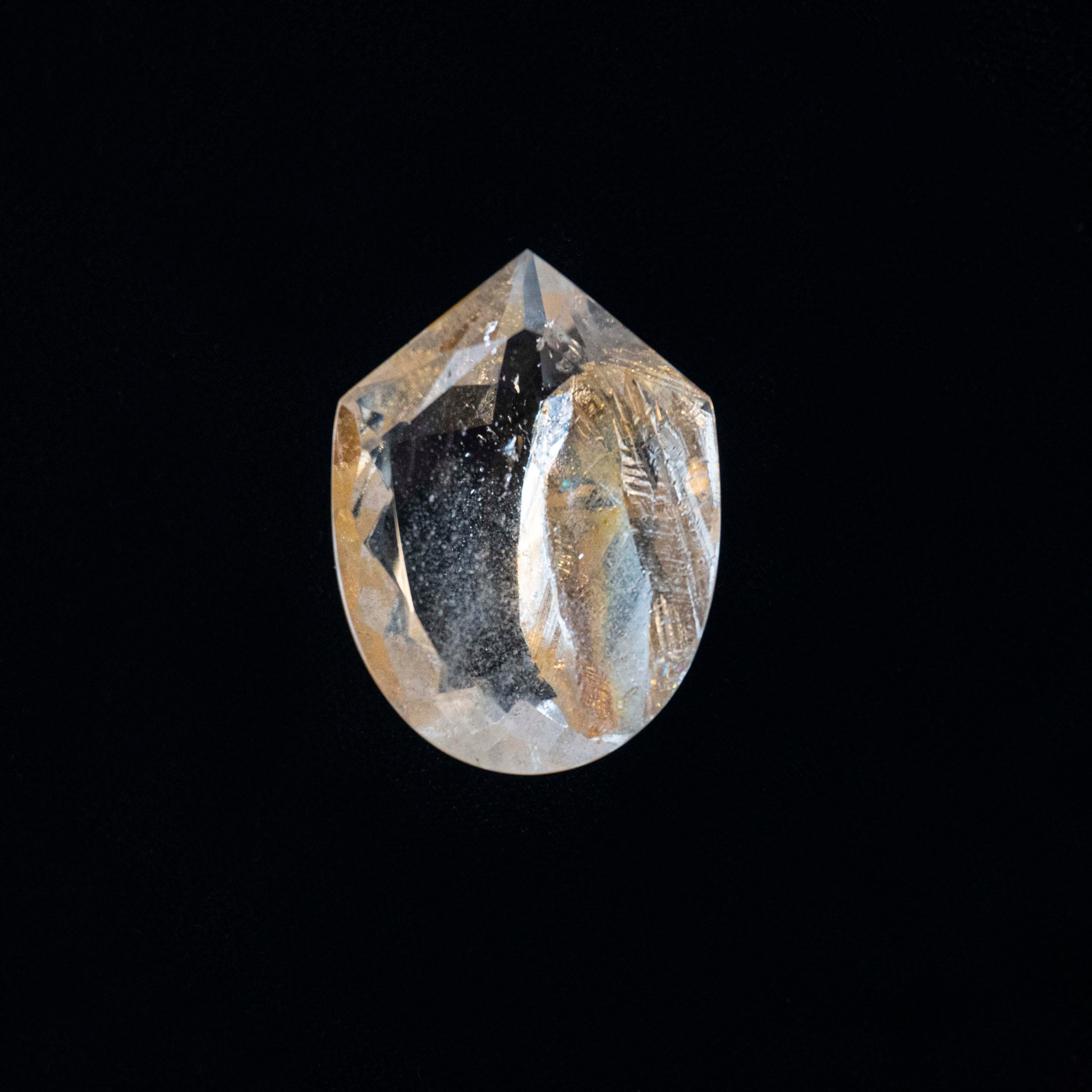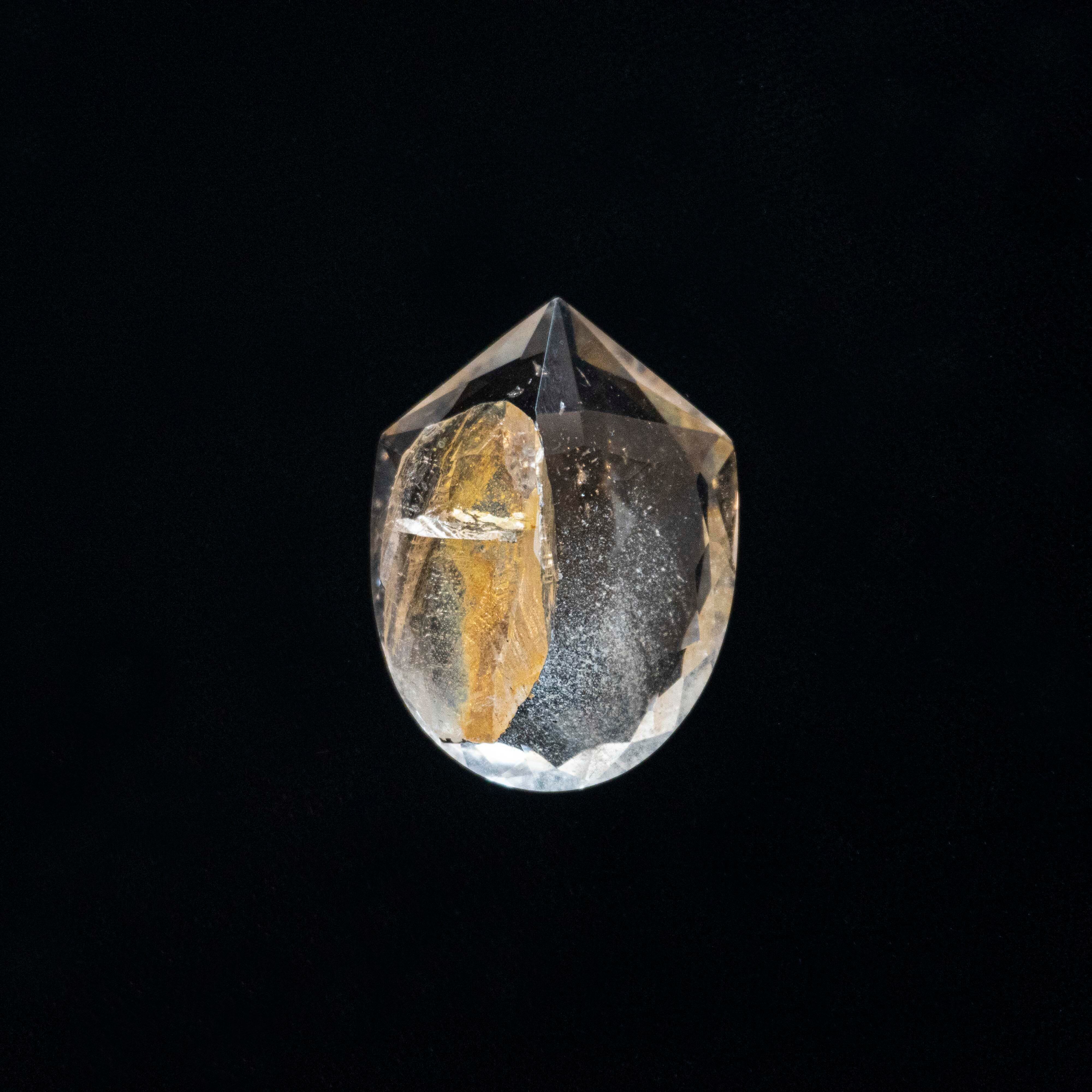 85カラット(17g)という大粒の、息をのむほどにクリアな水晶。 その静寂の空間に、まるで時が止まったかのように、黄金色に輝くリモナイト(褐鉄鉱)が浮かんでいます。