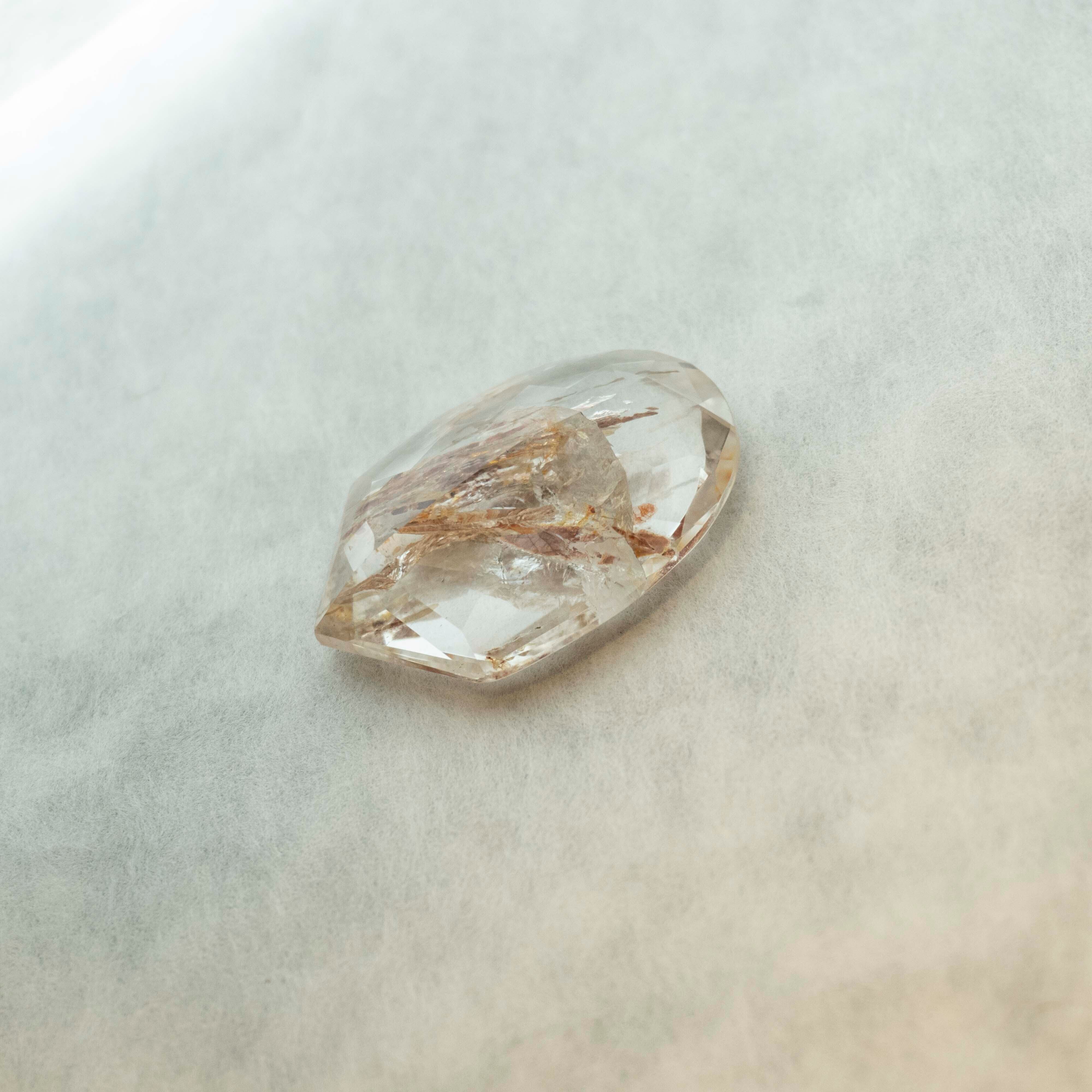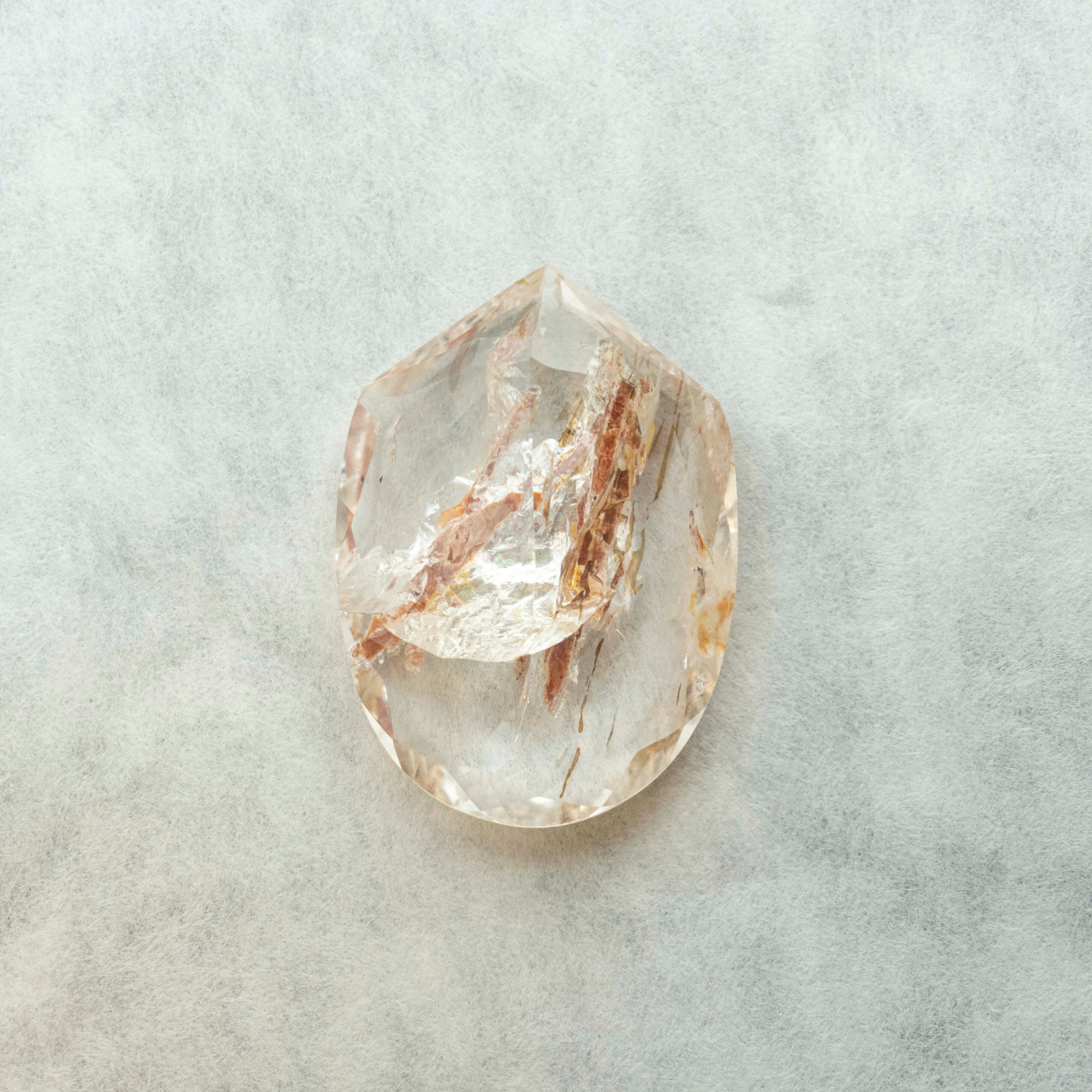 状態: 芸術的な「赤い羽」(ファイアークォーツ)を持つ、宝石品質のファセット・ルースです。