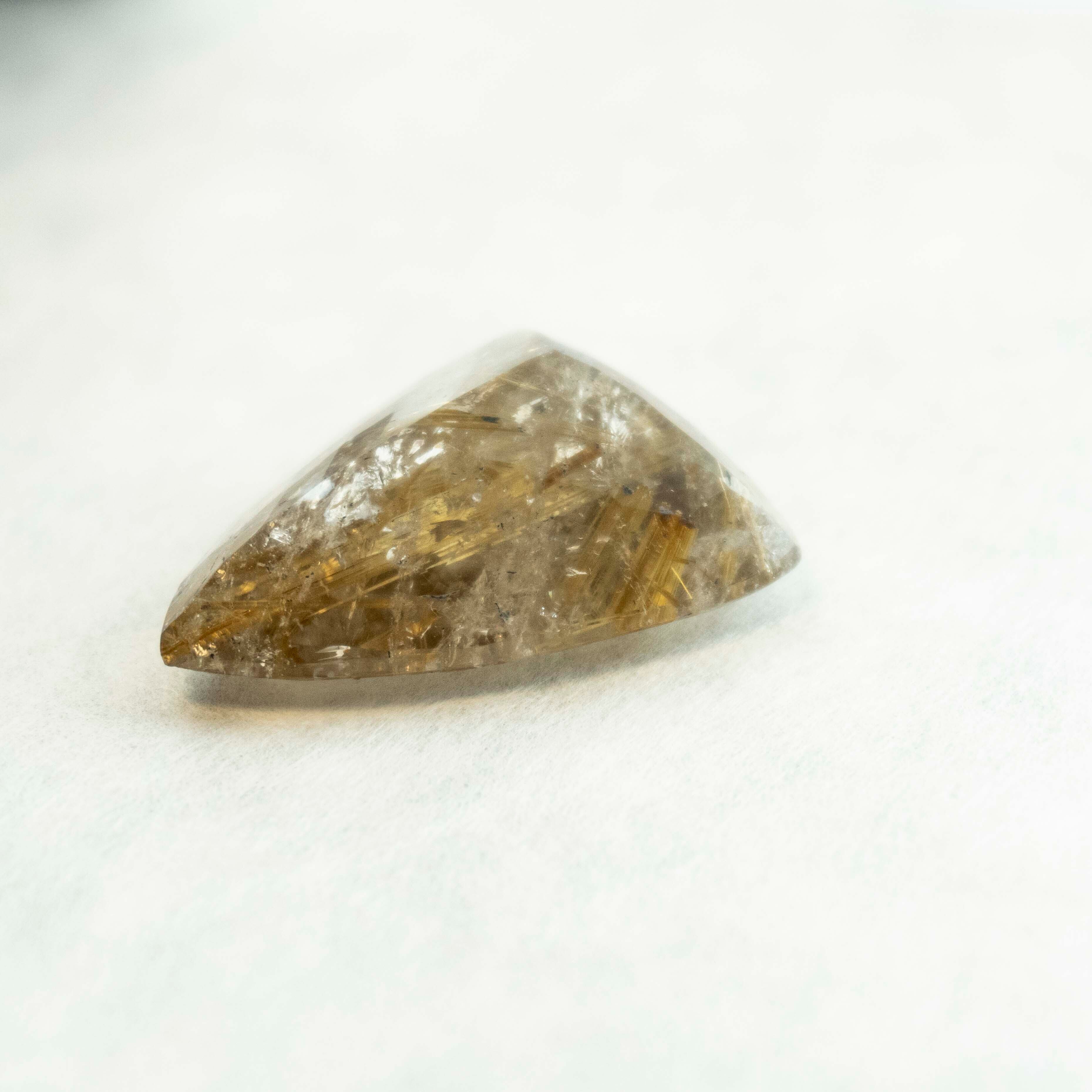 状態: 力強い「タイチンルチル」と「虹」を持つ、大粒のファンシーファセットカットが施された一点物のルースです。